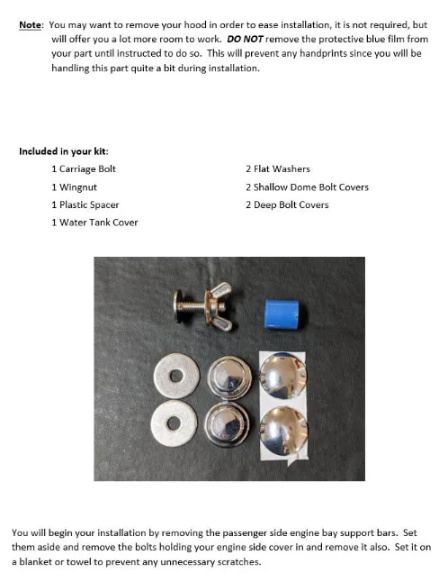 Designed for serious Prowler owners who want a true show-car engine compartment. Watch them smile when you open the hood! It will never rust or stain and will always keep its shiny luster.