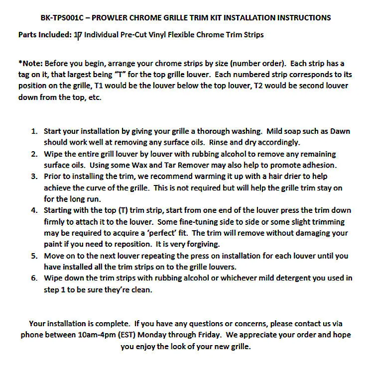 Installation is extremely easy — no glue or tools are required. Each of the 17 strips is individually sized and tagged for you to simply push over each grille louver. You do not need to remove any parts from the car, and no screws or adhesives are necessary.