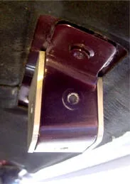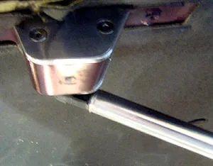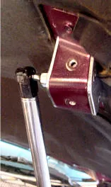 - Locate the steel bracket on the driver’s side that secures the factory hood prop and support rails. Mark the center of this bracket and drill a 5/16 hole directly in the middle (or adjust placement so the hood engine bars do not interfere). Bolt on the pivot ball at the end of your new prop. The hole must be this diameter. (See picture 6 below.)