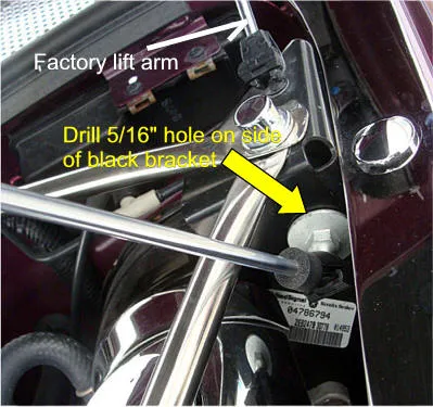 This kit uses factory brackets and requires drilling one small hole in a factory bracket under the hood in the engine compartment, where the bottom end of the lift arm connects.