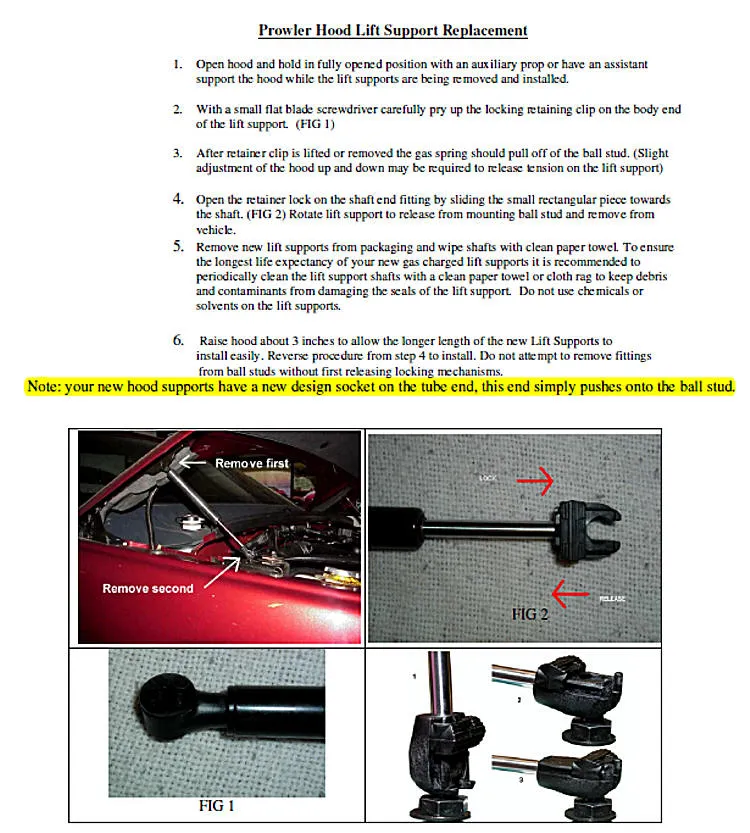Every Prowler owner knows that the stock lift arms that come with the Prowler or its trailer, whether new or ordered from Chrysler as replacement parts, do not hold up very long. We provide aftermarket strong trunk lifts that will lift your trunk lid and hold it there. They will last longer than the original arms.