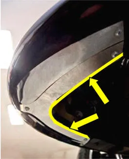 6. At this point, the cover should have a snug fit all around except at the very front point of the cover. Typically, there will be a small gap here that will be taken up by the last forward screw and flat nut. This is the final step of the installation.